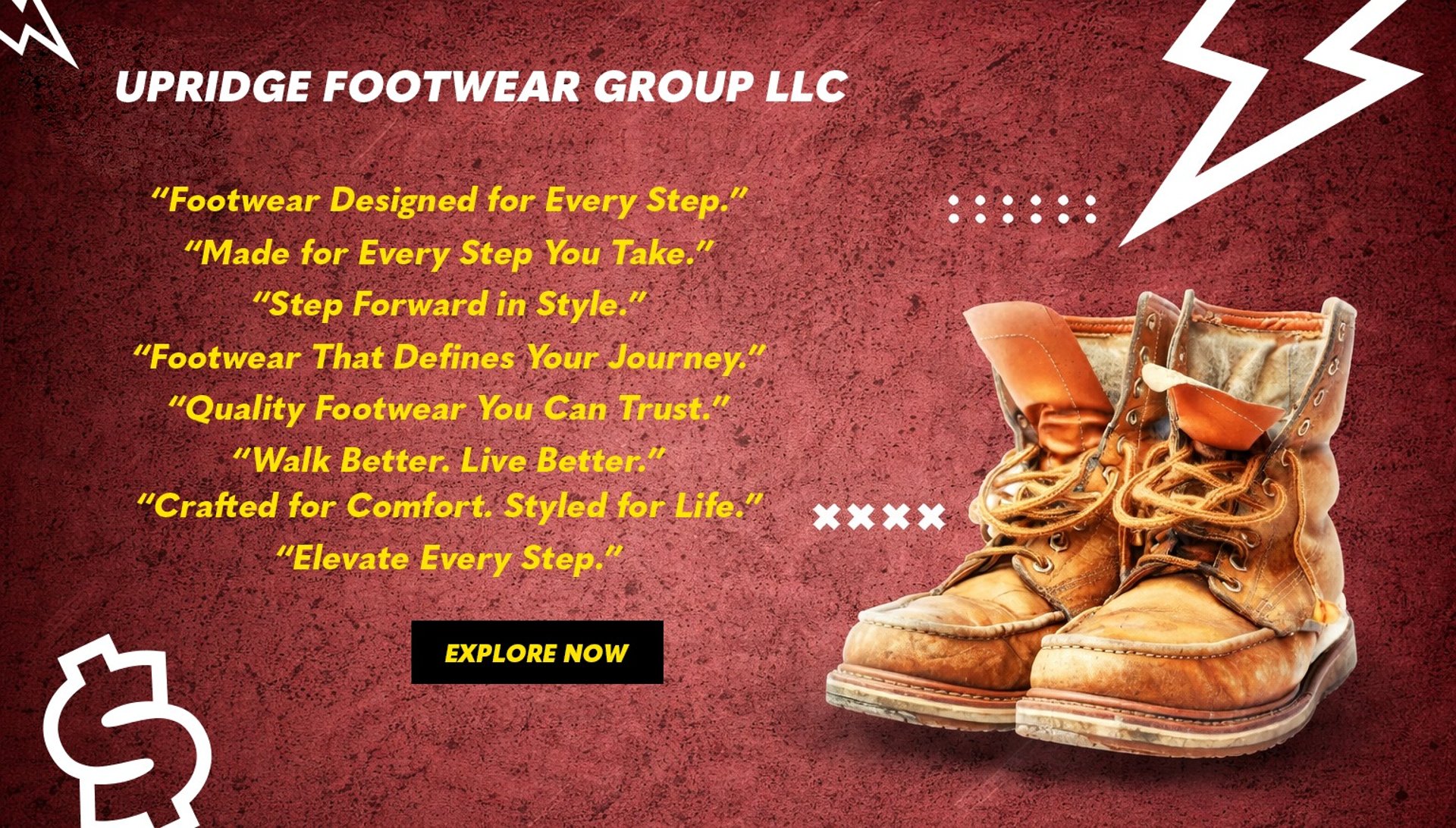 “Upridge Footwear Group LLC was created with a simple goal—to provide footwear that combines comfort, quality, and style. What started as a passion for well-made shoes has grown into a brand dedicated to helping people step forward with confidence. We carefully select and design our footwear to meet everyday needs while maintaining a modern look. At Upridge Footwear Group LLC, we believe the right pair of shoes can make a difference, and we are committed to delivering products our customers can trust.”